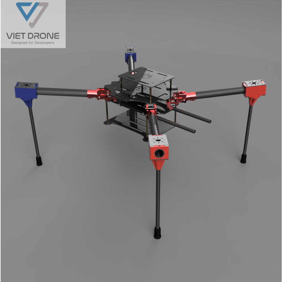 - Khung chính: sử dụng tấm sợi carbon dày 2 mm, thiết kế phân tầng để sắp xếp linh kiện rõ ràng. Tầng trên dành cho máy tính nhúng, tầng chính đặt bộ điều khiển bay và có chỗ mở rộng kết nối linh kiện theo bố cục hình chữ nhật, tầng giữa chứa board phân phối nguồn và ESC, tầng dưới để pin. Thiết kế này giúp dễ dàng lắp đặt, bảo trì và cân bằng trọng lượng.